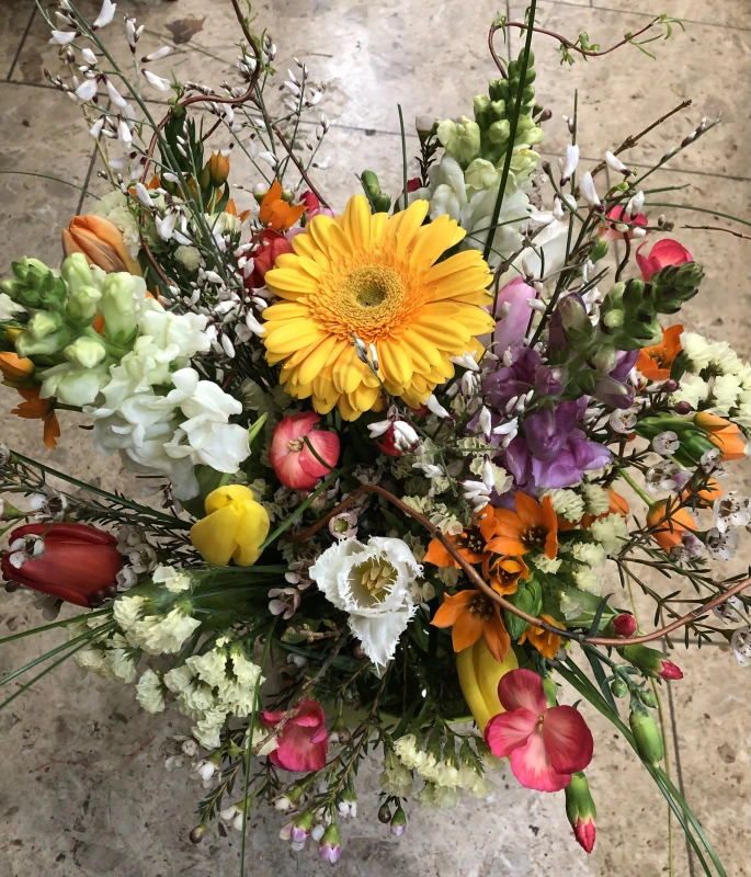 Bei dem abgebildeten Strauß handelt es sich um ein Musterarrangement. Einzelne Blumen, Anzahl der Blumen und Farbtöne können je nach saisonaler Verfügbarkeit variieren.
